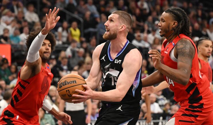Utah Jazz guard Svi Mykhailiuk (19) splits Portland Trail Blazers guard Matisse Thybulle (4) and Trail Blazers forward Kris Murray (24) as he goes for a shot as they play at the Delta Center in Salt Lake City on Wednesday, April 9, 2025. Jazz won 133-126 in OT. | Scott G Winterton, Deseret News