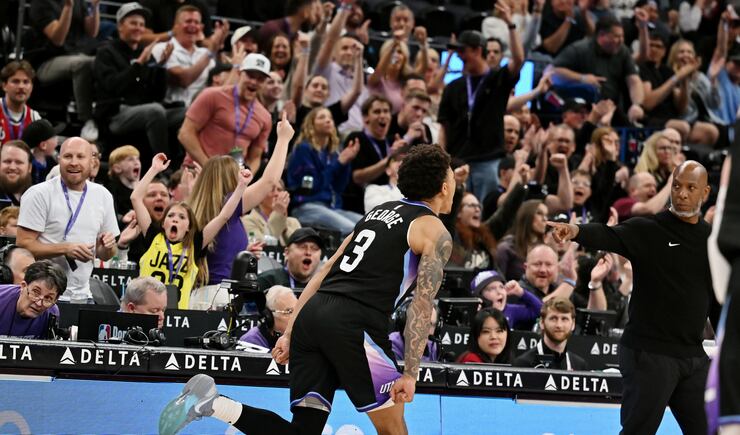 Fans erupt as Utah Jazz guard Keyonte George (3) drops in a shot as the Jazz and the Portland Trail Blazers play at the Delta Center in Salt Lake City on Wednesday, April 9, 2025. Jazz won 133-126 in OT. | Scott G Winterton, Deseret News
