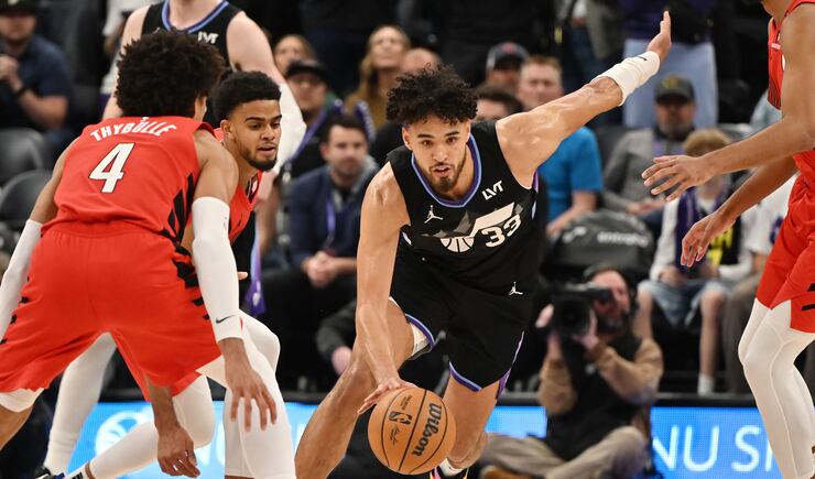 Utah Jazz forward Kyle Filipowski (22) battles Portland Trail Blazers forward Toumani Camara (33) for the ball as they play at the Delta Center in Salt Lake City on Wednesday, April 9, 2025. | Scott G Winterton, Deseret News