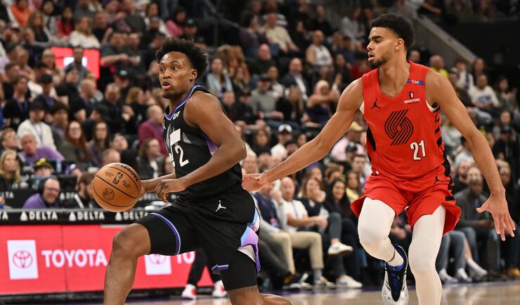 Utah Jazz guard Collin Sexton (2) drives toward the hoop with Portland Trail Blazers guard Rayan Rupert (21) following behind as they play at the Delta Center in Salt Lake City on Wednesday, April 9, 2025. Jazz won 133-126 in OT. | Scott G Winterton, Deseret News