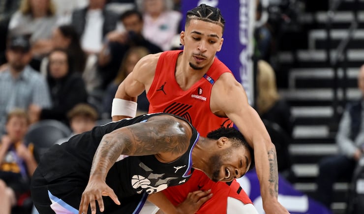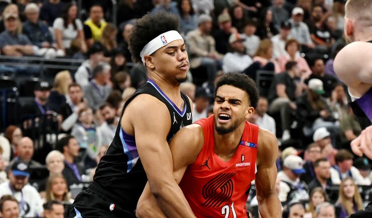 Utah Jazz forward Brice Sensabaugh (28) is whistled for a foul on Portland Trail Blazers guard Shaedon Sharpe (17) as they play at the Delta Center in Salt Lake City on Wednesday, April 9, 2025. Jazz won 133-126 in OT. | Scott G Winterton, Deseret News
