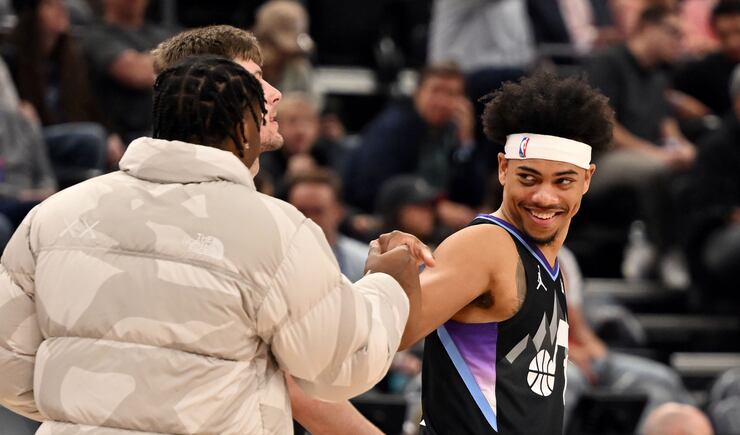 Utah Jazz guard Jaden Springer (11) has a laugh with teammates as the Jazz and the Portland Trail Blazers play at the Delta Center in Salt Lake City on Wednesday, April 9, 2025. Jazz won 133-126 in OT. | Scott G Winterton, Deseret News