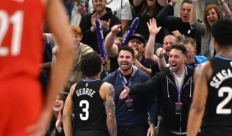 Utah Jazz guard Keyonte George (3) celebrates with fans after dropping in a 3-point shot as the Jazz and the Portland Trail Blazers play at the Delta Center in Salt Lake City on Wednesday, April 9, 2025. Jazz won 133-126 in OT. | Scott G Winterton, Deseret News