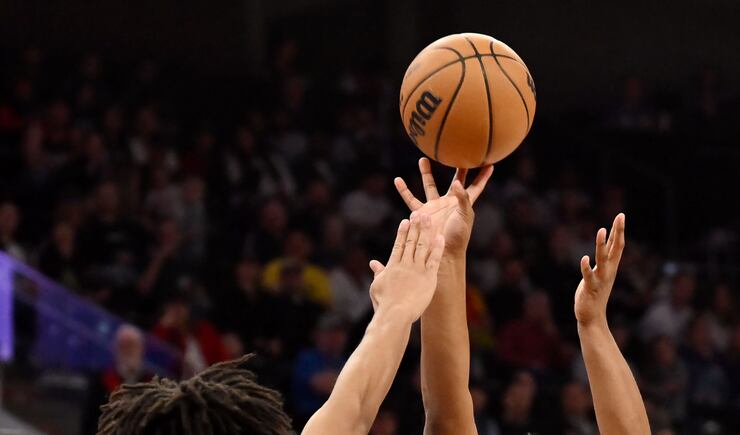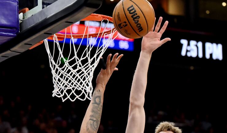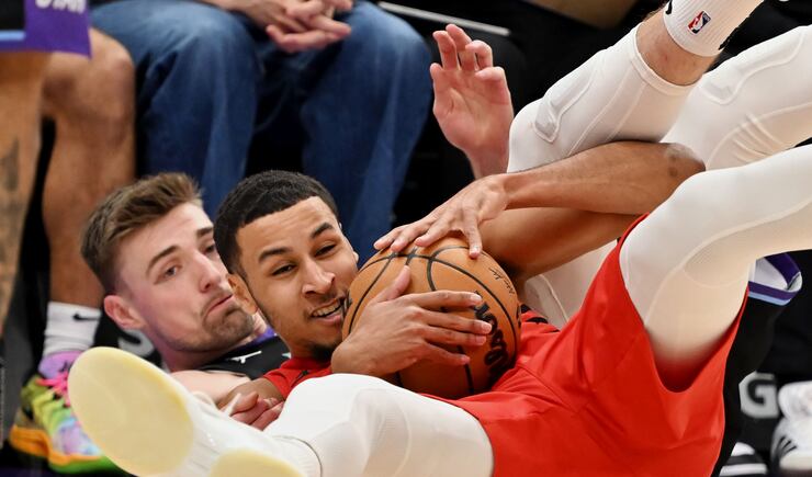 Utah Jazz forward Brice Sensabaugh (28) and Portland Trail Blazers forward Jabari Walker (34) wrestle for the ball as they play at the Delta Center in Salt Lake City on Wednesday, April 9, 2025. Jazz won 133-126 in OT. | Scott G Winterton, Deseret News
