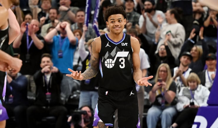 Utah Jazz guard Keyonte George (3) gestures after making a shot as the Jazz and the Portland Trail Blazers play at the Delta Center in Salt Lake City on Wednesday, April 9, 2025. Jazz won 133-126 in OT. | Scott G Winterton, Deseret News