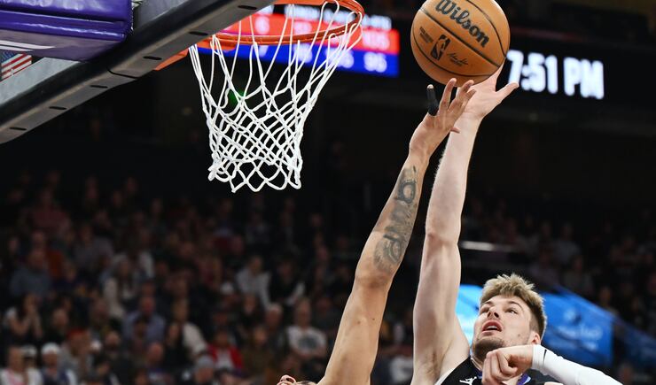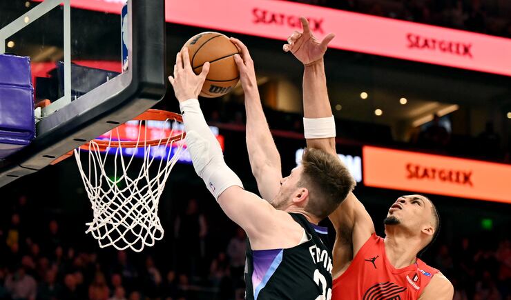 Utah Jazz forward Kyle Filipowski (22) blocks a shot by Portland Trail Blazers forward Toumani Camara (33) at the hoop as they play at the Delta Center in Salt Lake City on Wednesday, April 9, 2025. | Scott G Winterton, Deseret News