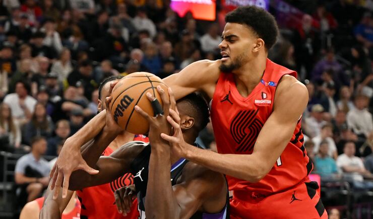 Utah Jazz forward Kyle Filipowski (22) battles Portland Trail Blazers center Donovan Clingan (23) for the ball as they play at the Delta Center in Salt Lake City on Wednesday, April 9, 2025. | Scott G Winterton, Deseret News