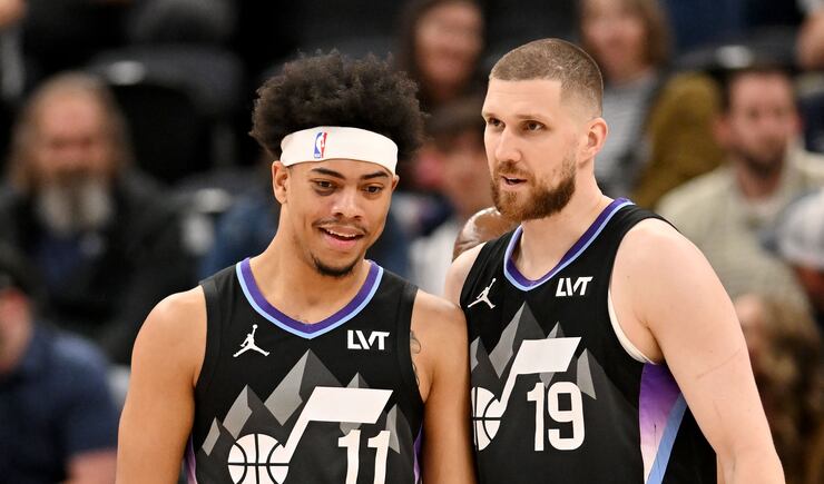 Utah Jazz guards Jaden Springer (11) and Svi Mykhailiuk (19) talk as the Jazz and the Portland Trail Blazers play at the Delta Center in Salt Lake City on Wednesday, April 9, 2025. | Scott G Winterton, Deseret News