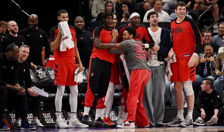 Portland Trail Blazers react after a monster dunk by Trail Blazers guard Matisse Thybulle (4) as they play at the Delta Center in Salt Lake City on Wednesday, April 9, 2025. The Utah Jazz won 133-126 in OT. | Scott G Winterton, Deseret News