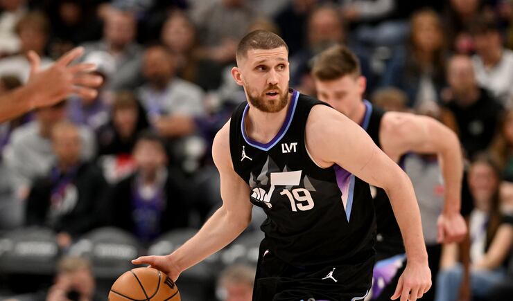 Utah Jazz guard Svi Mykhailiuk (19) looks for a teammate to pass to as they play at the Delta Center in Salt Lake City on Wednesday, April 9, 2025. Jazz won 133-126 in OT. | Scott G Winterton, Deseret News