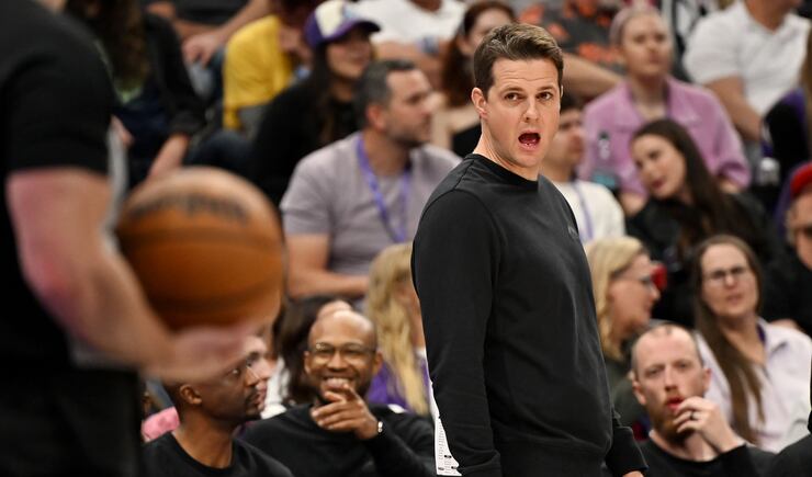 Utah Jazz head coach Will Hardy makes a face toward a referee as the Jazz and the Portland Trail Blazers play at the Delta Center in Salt Lake City on Wednesday, April 9, 2025. Jazz won 133-126 in OT. | Scott G Winterton, Deseret News