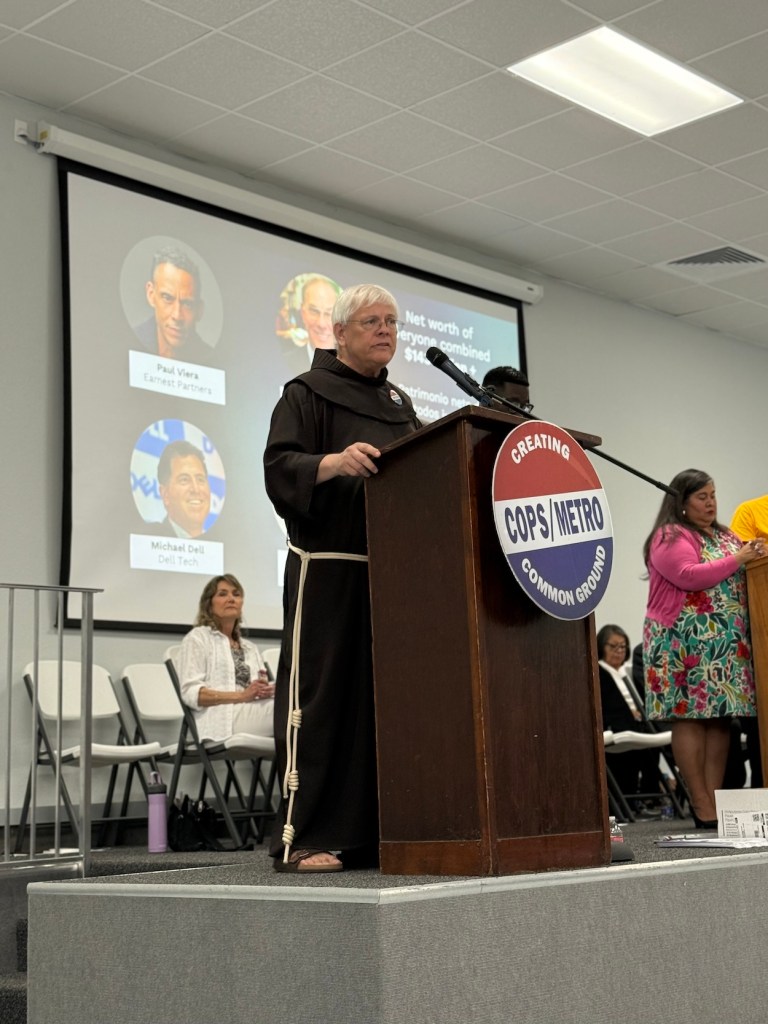 “It is our birthright to change our reality for our families to fight the pharaohs of today — no more golden calves,” Father Dennis Schafer told the crowd to loud applause. “The owners of the [Spurs] are worth $143 billion. We are being asked to give away our resources so that others can enrich themselves. They can pay, and they can build their potent capital. Empty promises and flashy publicity campaigns will not seduce us.”