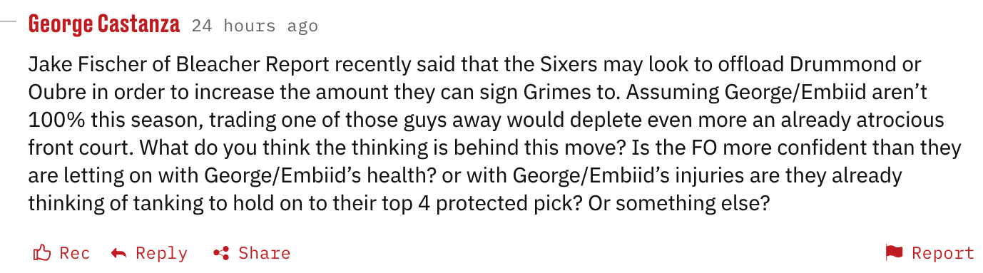 I don’t think it’s about the team believing Joel Embiid and Paul George will be healthy — or so unhealthy to the point of tanking. In the case of Drummond, if Embiid isn’t healthy, how competitive can this team really be? A play-in spot is certainly feasible in the depleted East. But is Drummond the difference between the 10th or 11 seed? Does that even matter? If Embiid is unable to play this season, it feels more much valuable to see what you have in guys like Adem Bona and Johni Broome than retreading with Drummond.