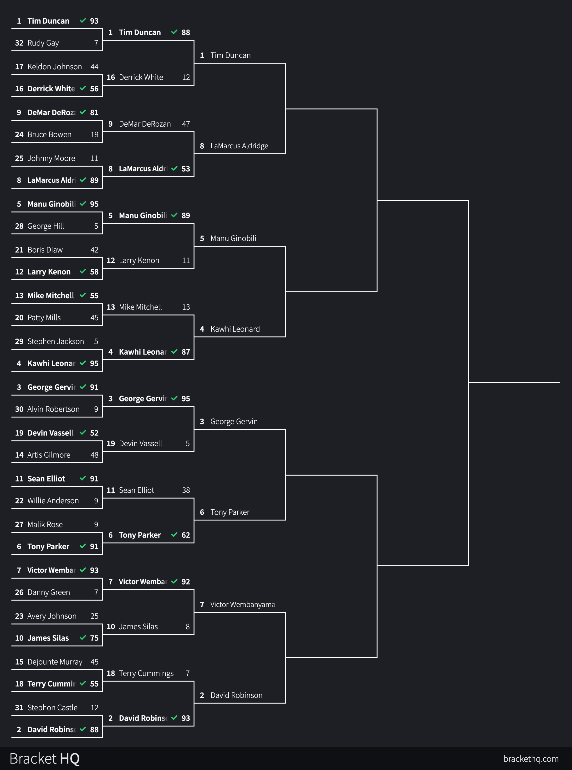 Each player is at the prime of their Spurs tenure. So someone like Kawhi Leonard or Dominique Wilkins would represent their peak season as a Spur, not the best of their career.Assume traditional 1-on-1 rules for the tournament. Half court, games to 11 straight up (ones and twos), no offensive rebounds, and checking the ball after a score. For this exercise, we’ll be alternating possessions, so no “make it, take it.”Single elimination tournament bracket. If a player loses, they are done.