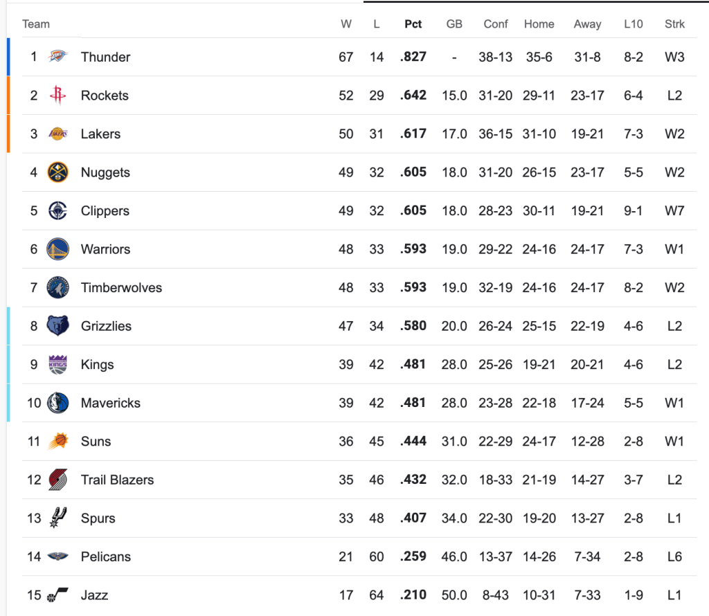 Oklahoma City ran away with the top seed and holds a massive 15.0-game lead over the Rockets, who enter the playoffs as the second seed. In addition, the Los Angeles Lakers managed to clinch the third seed by winning the Pacific Division with their 50-31 record.