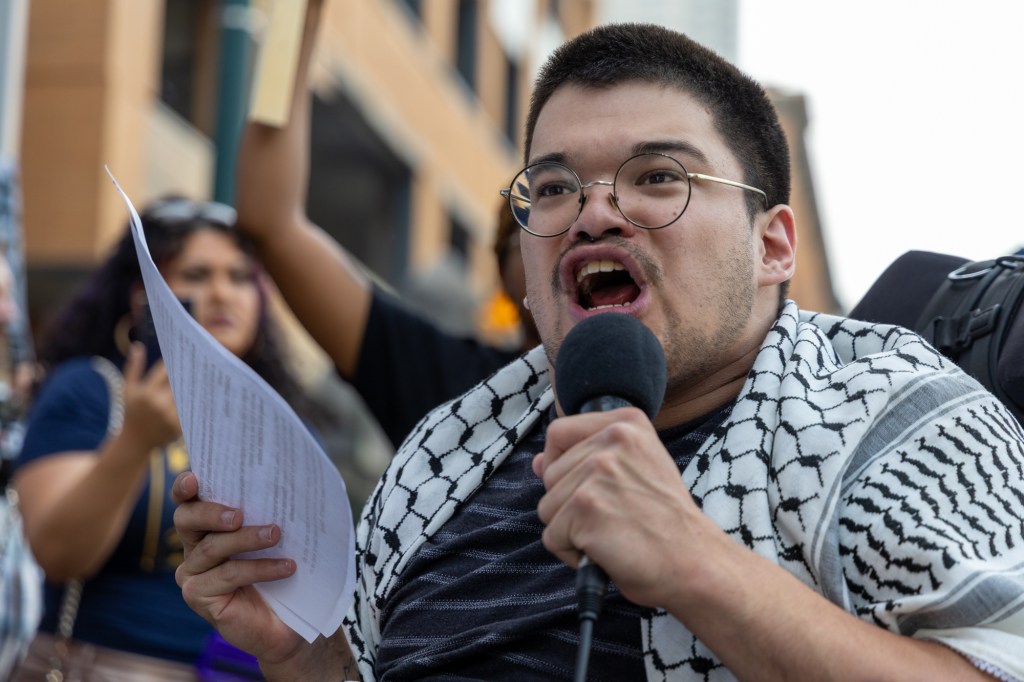 Indianapolis Liberation Center member Riley Park introduced each speaker before leading the protest towards Circle Centre Mall. Credit: Claire Nguyen/Mirror Indy