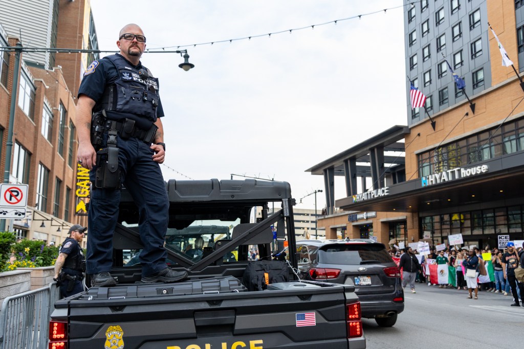 Indianapolis Metro Police stand on the back of their trucks to manage protesters. Credit: Claire Nguyen/Mirror Indy