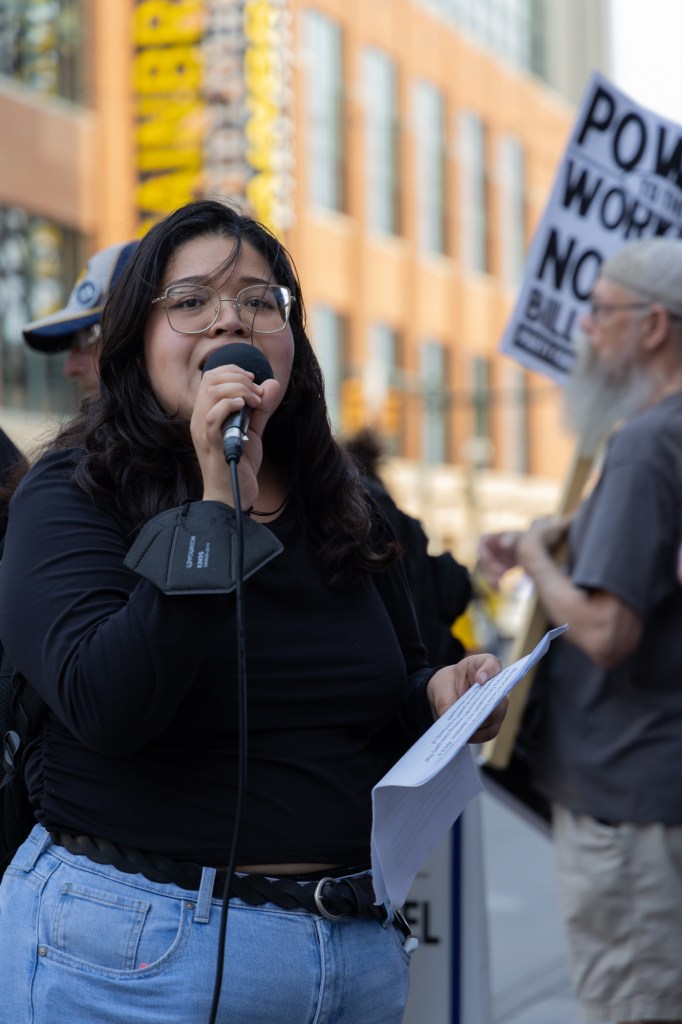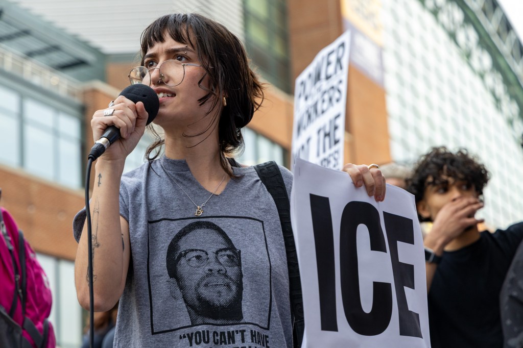Party for Socialism and Liberation organizer Cecilia Gomez speaks into a microphone.