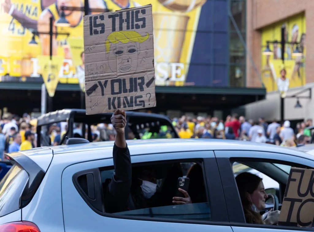 Pacers fans greeted the demonstrators , some with heckles, others with cheers. Drivers honked in support. People carried upside down American flags.