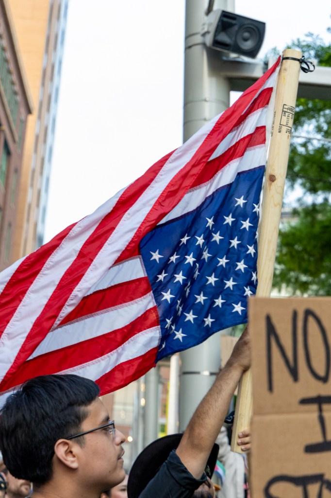 A protester waves an upside-down American flag at the end of the protest. Credit: Claire Nguyen/Mirror Indy