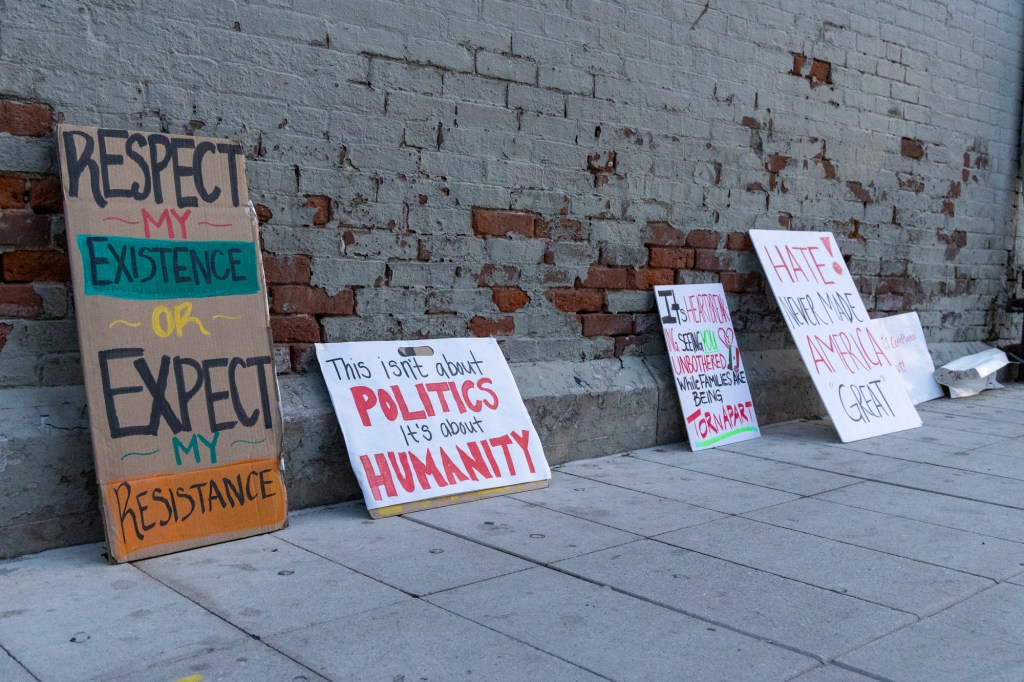 Signs lean against a brick wall after an immigration enforcement protest. Credit: Claire Nguyen/Mirror Indy