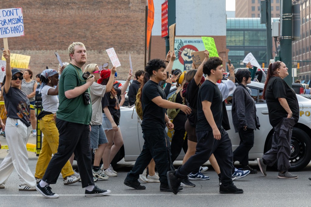 He and the two others, all strangers to each other, melted into a crowd that appeared to surpass at least 800 people marching through downtown — chanting, dancing and even spraying silly string. Organizers from the Indianapolis chapter of the Party for Socialism and Liberation said at one point, the crowd swelled to 1,000 people.
