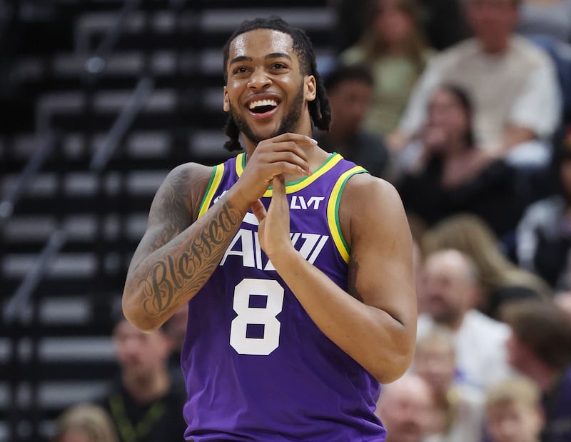 Utah Jazz forward Brice Sensabaugh (8) smiles after a call in Salt Lake City on Thursday, April 11, 2024. Utah won 124-121. | Jeffrey D. Allred, Deseret News