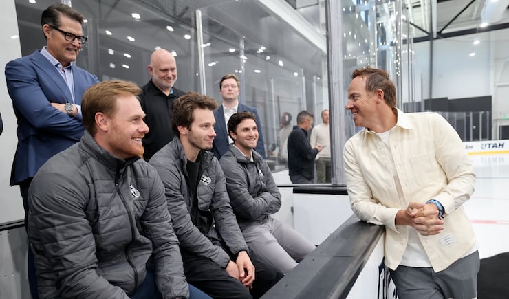 Utah Mammoth players Lawson Crouse, Mikhail Sergachev and Alexander Kerfoot talk with Ryan Smith, owner of the Utah Jazz and Utah Mammoth, during the unveiling of the Utah Mammoth training facility in Sandy on Wednesday, Sept. 17, 2025. | Kristin Murphy, Deseret News