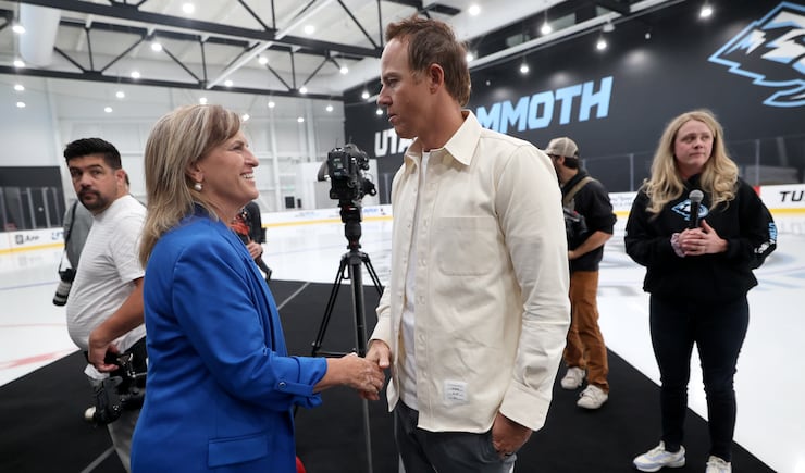 Sandy Mayor Monica Zoltanski shakes hands with Ryan Smith, owner of the Utah Jazz and Utah Mammoth, during the unveiling of the Utah Mammoth training facility in Sandy on Wednesday, Sept. 17, 2025. | Kristin Murphy, Deseret News