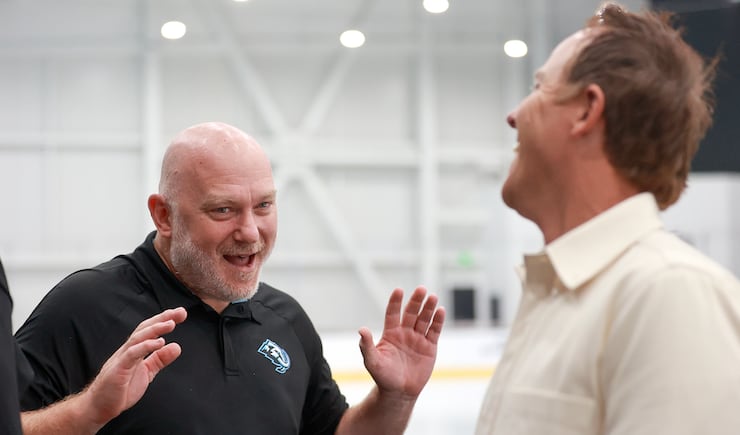 Utah Mammoth head coach André Tourigny talks with Utah Mammoth owner Ryan Smith during the unveiling of the Utah Mammoth training facility in Sandy on Wednesday, Sept. 17, 2025. | Kristin Murphy, Deseret News