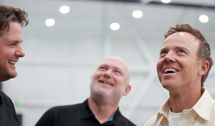 Utah Jazz head coach Will Hardy, Utah Mammoth head coach André Tourigny and Ryan Smith, owner of the Utah Jazz and Utah Mammoth, talk during the unveiling of the Utah Mammoth training facility in Sandy on Wednesday, Sept. 17, 2025. | Kristin Murphy, Deseret News