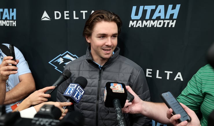 Utah Mammoth associate captain Alexander Kerfoot talks to members of the media during the unveiling of the Utah Mammoth training facility in Sandy on Wednesday, Sept. 17, 2025. | Kristin Murphy, Deseret News