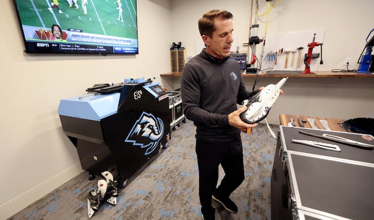 Tony Silva, Utah Mammoth head equipment manager, shows how he sharpens players’ skate blades during a tour of the Utah Mammoth training facility in Sandy on Wednesday, Sept. 17, 2025. | Kristin Murphy, Deseret News