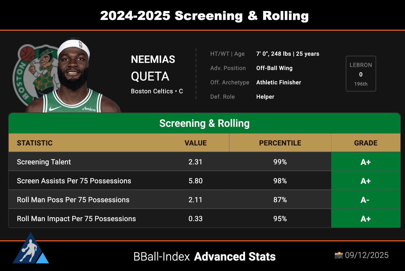 According to Bball Index, he ranked 14th in the NBA in screen assists per 75 possessions (5.8), placing him in the 99th percentile. He also finished 7th in overall screening talent (99th percentile) and landed in the 95th percentile in roll-man impact.