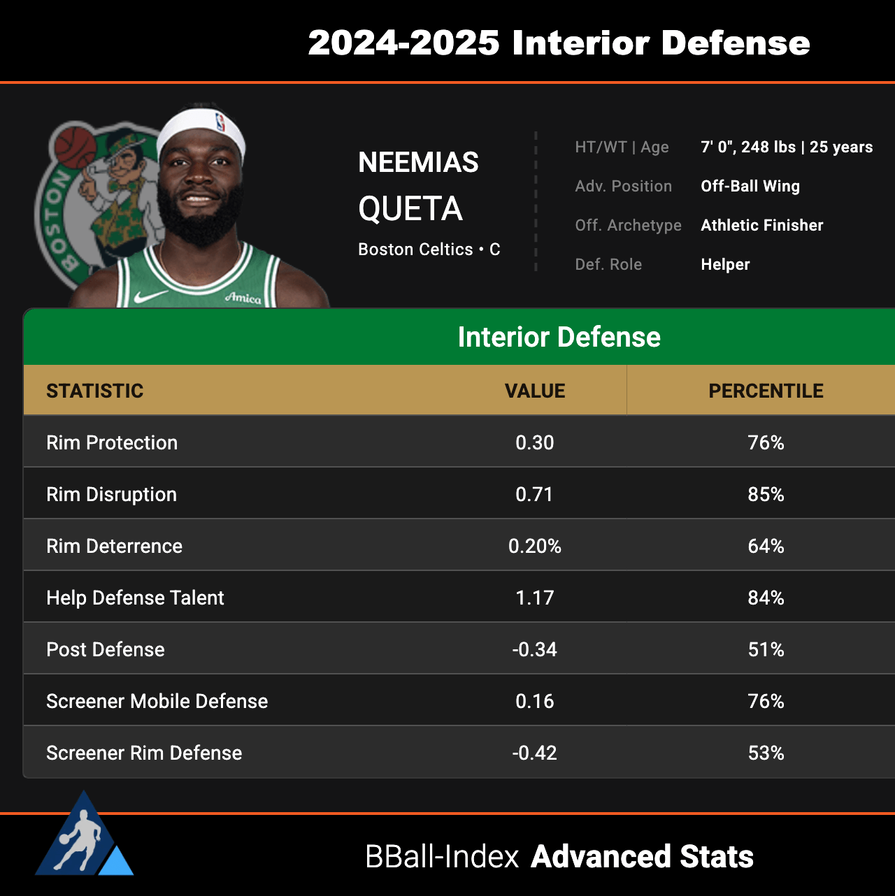 The much needed improvement here is strength and post defense. He ranked in the 51st percentile in post defense; the silver lining is that the league doesn’t feature a high volume of physically dominant scoring bigs, but it’s worth noting that the Celtics largely kept Queta away from those matchups when possible.