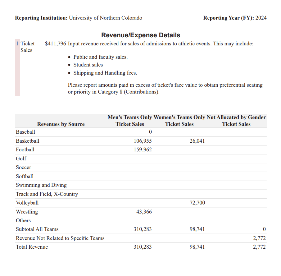 This data comes from each school’s NCAA-mandated MFRS report filing. Every single D-I and D-II school has to submit one of these things every year, and there’s a dedicated line item for “ticket revenue”. Here’s an example of what that form looks like, via Northern Colorado’s FY24 filing: