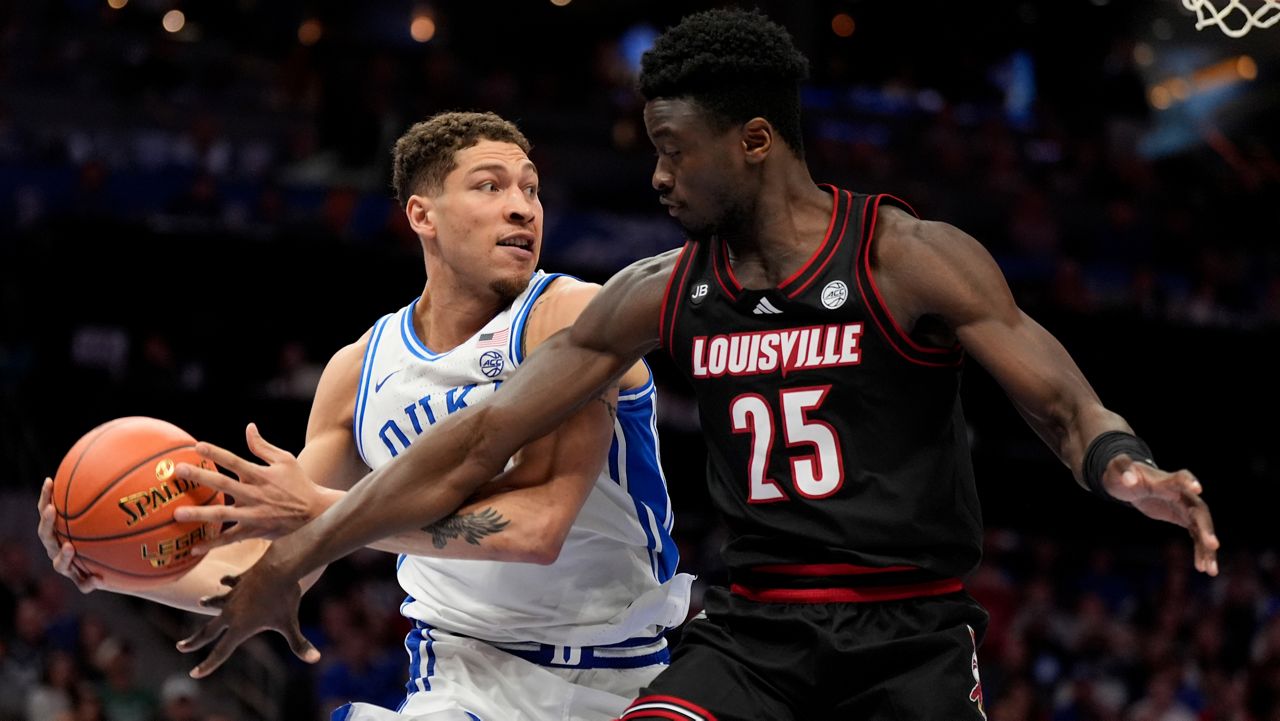 Duke forward Mason Gillis, left, vies for the ball with Louisville forward Aboubacar Traore during an NCAA college basketball game in the championship of the Atlantic Coast Conference tournament, Saturday, March 15, 2025, in Charlotte, N.C. (AP Photo/Chris Carlson)