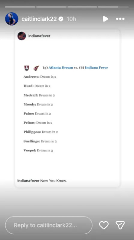 After the Fever punched their ticket to the WNBA semifinals, Clark posted a screenshot of every ESPN staff member’s prediction for the first round of the playoffs.