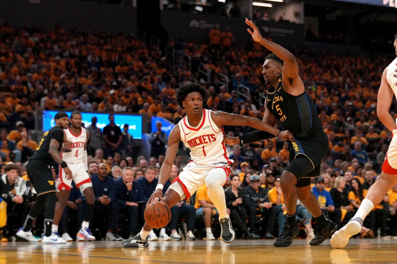 May 2, 2025; San Francisco, California, USA; Houston Rockets forward Amen Thompson (1) dribbles the ball next to Golden State Warriors forward Kevon Looney (5) in the second quarter of game six of the first round for the 2025 NBA Playoffs at Chase Center. Mandatory Credit: Cary Edmondson-Imagn Images