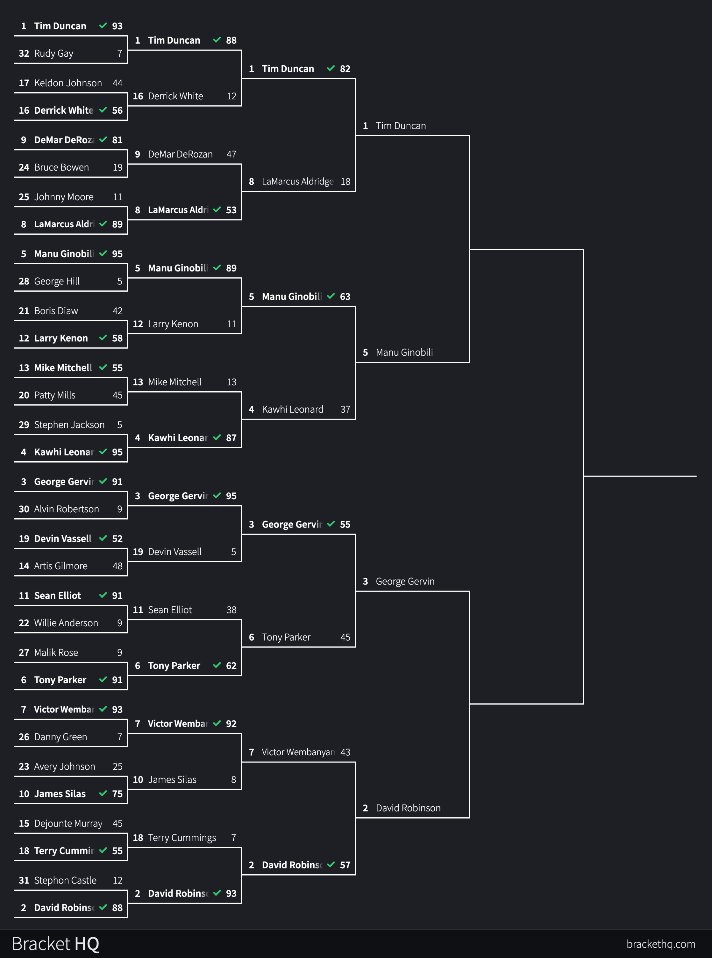 Each player is at the prime of their Spurs tenure. So someone like Kawhi Leonard or Dominique Wilkins would represent their peak season as a Spur, not the best of their career.Assume traditional 1-on-1 rules for the tournament. Half court, games to 11 straight up (ones and twos), no offensive rebounds, and checking the ball after a score. For this exercise, we’ll be alternating possessions, so no “make it, take it.”Single elimination tournament bracket. If a player loses, they are done.
