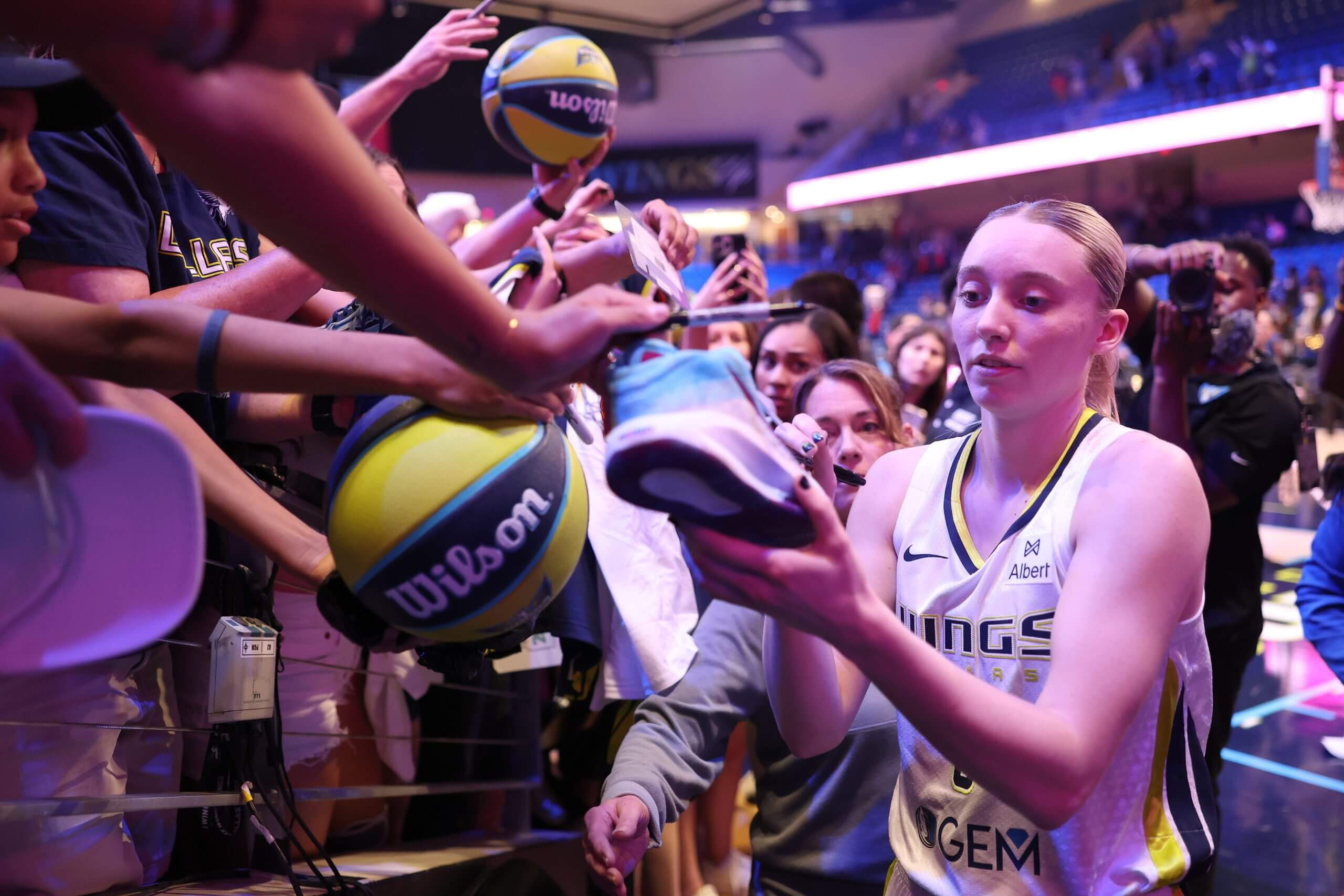 Paige Bueckers signs autographs after a Dallas Wings preseason game. She was the No. 1 pick in the 2025 WNBA Draft in April. (Sam Hodde / Getty Images)