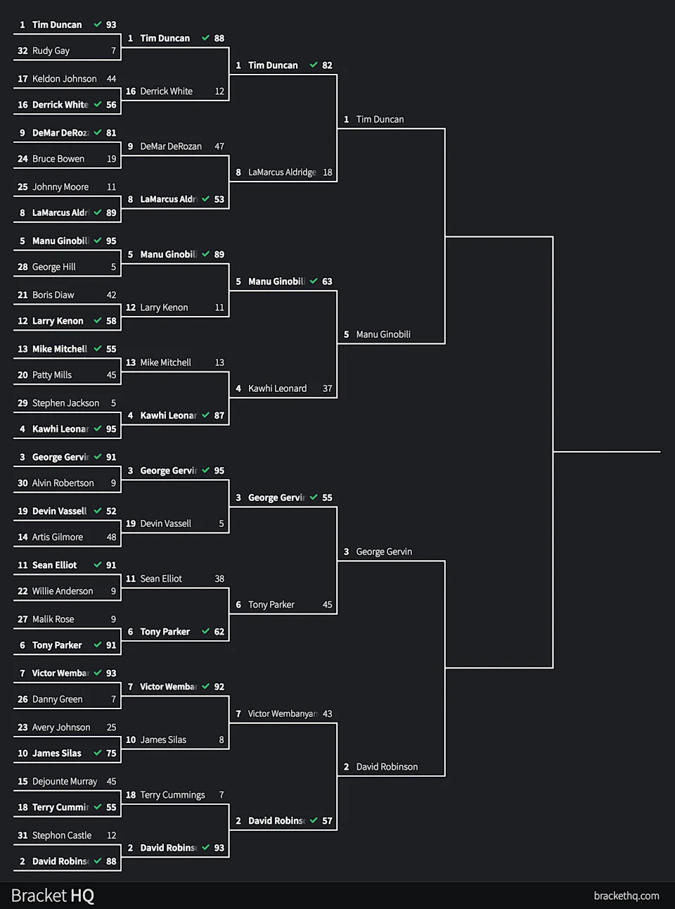 Jacob: It’s hard to find a more fitting matchup in this tournament. Two of the biggest names behind one of the most iconic stretches in NBA history face off for ultimate bragging rights (I’m being dramatic, I know). Manu’s scoring chops make this a respectable matchup, even with a size disadvantage. But Duncan is a stout defender and would physically dominate this game. It has felt like we were destined for a Big Fundamental vs. The Admiral final. I expect at least one half of that to happen.