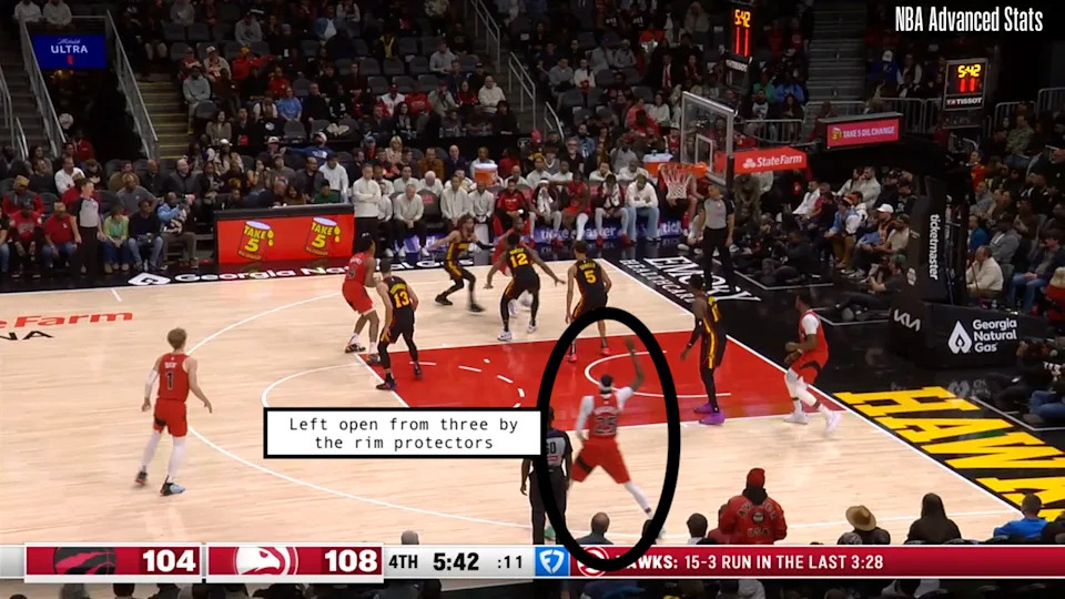 First of all, he is not always guarded beyond the line, especially on the weak side, because his shooting motion is slow and opponents can recover. Moreover, his inability to attack with his size makes it easy for teams to assign a wing or a guard to defend him on the perimeter, as it’s unlikely that he will bully them to the rim.