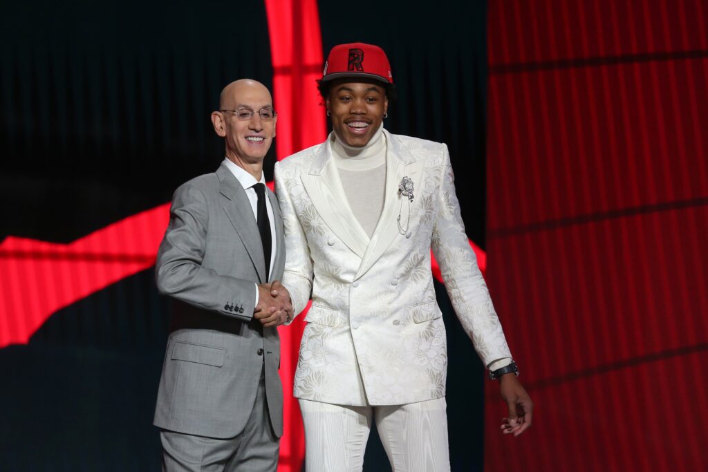 Jul 29, 2021; Brooklyn, New York, USA; Scottie Barnes (Florida State) poses with NBA commissioner Adam Silver after being selected as the number four overall pick by the Toronto Raptors in the first round of the 2021 NBA Draft at Barclays Center. Mandatory Credit: Brad Penner-USA TODAY Sports