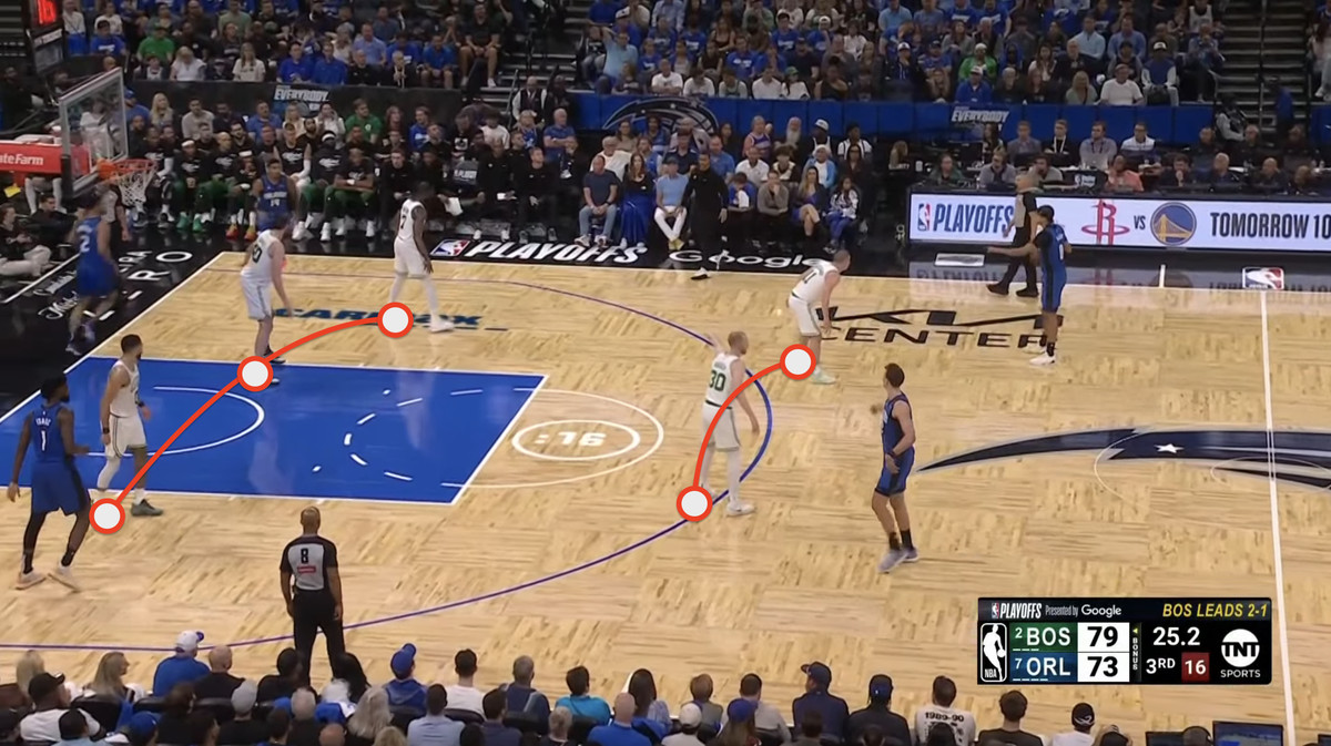 The Magic defense is confident and won’t send help. They are forcing the Celtics to do what they usually don’t. In a regular game, the team would start to send help on the post-up and isolation from Jayson Tatum, but not the Magic. So, Tatum had to do what he loves: play one-on-one basketball and take superstar shots.