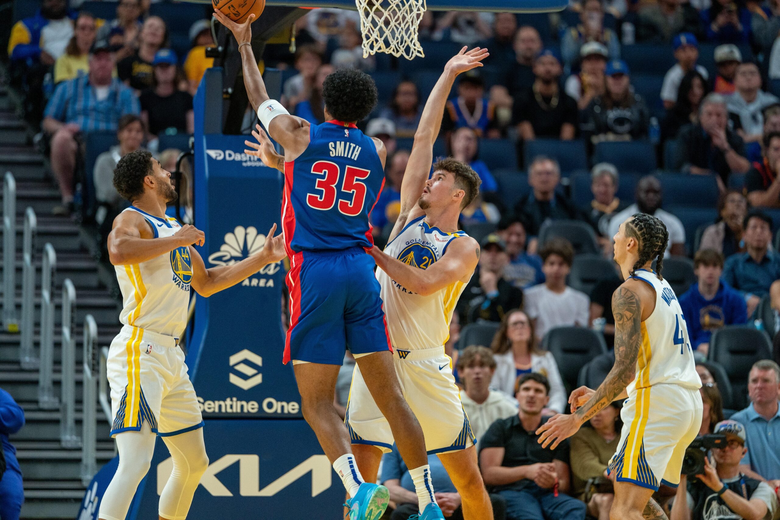 Oct 13, 2024; San Francisco, California, USA; Detroit Pistons forward Tolu Smith (35) shoots a layup against Golden State Warriors center Quinten Post (21) during the fourth quarter at Chase Center. Mandatory Credit: Neville E. Guard-Imagn Images
