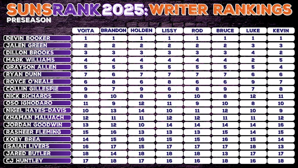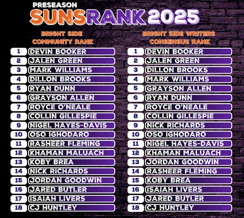 Training camp is here, Media Day quotes have drifted down like confetti, and with them comes the moment of truth: our final preseason SunsRank. Votes were tallied, debates waged, egos bruised, and somewhere in the chaos, we arrived at a list that feels like both lines in the sand and guesswork.