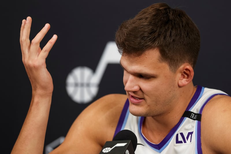 Utah Jazz center Walker Kessler (24) reacts while talking about his contract situation during the Utah Jazz media day at the Zions Bank Basketball Campus in Salt Lake City on Monday, Sept. 29, 2025. | Rio Giancarlo, Deseret News