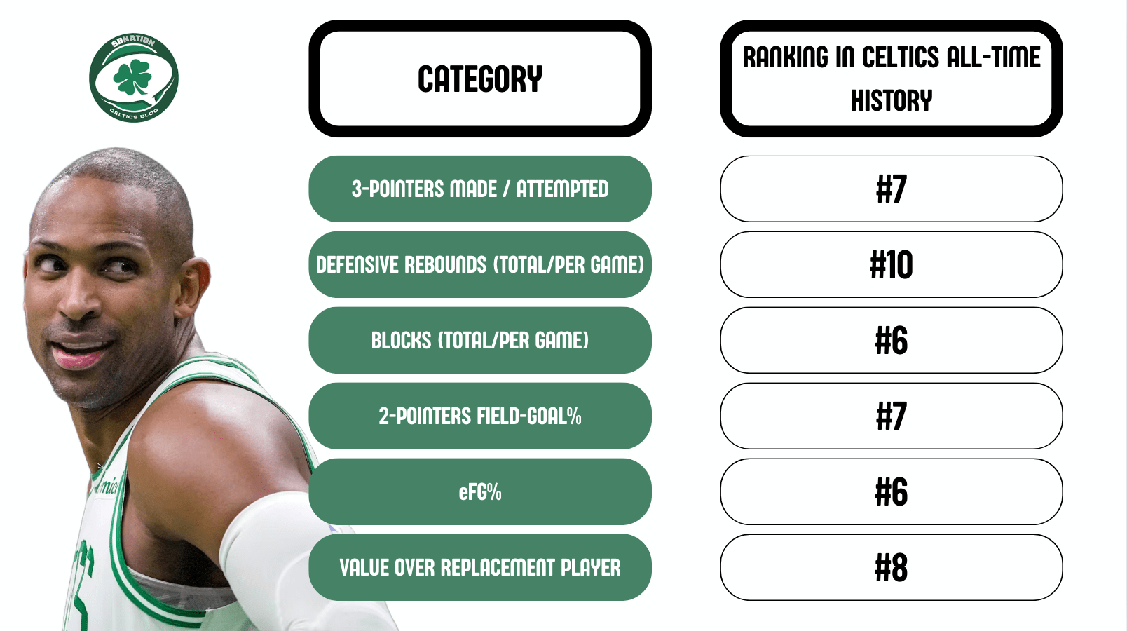 His rankings are quite revealing and highlight how modern his game truly is. He’s top 10 in total rebounds and rebounds per game. Same for blocks, ranking sixth all-time for the Celtics. But he’s also in the top 10 for 3-pointers made and attempted — and among the most efficient players, ranking top 10 in eFG% and 2-point FG%.