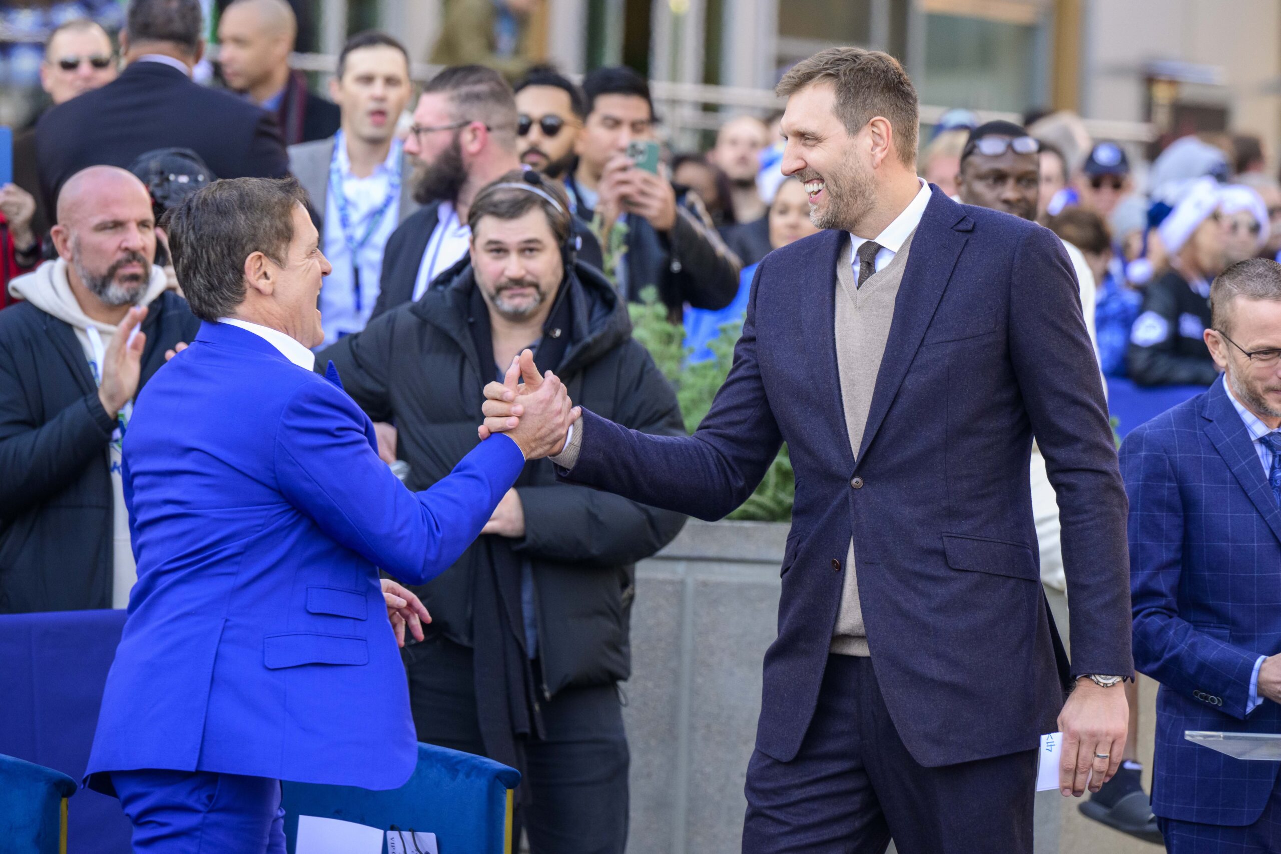 Dec 25, 2022; Dallas, Texas, USA; (from left) Mark Cuban and former Dallas Mavericks’ power forward Dirk Nowitzki during the ceremony for the unveiling of a statue honoring Nowitzki before the game between the Dallas Mavericks and the Los Angeles Lakers American Airlines Center . Mandatory Credit: Jerome Miron-Imagn Images